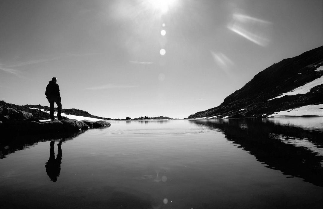 Print, gray frame. A serene black and white landscape featuring a lone figure near a reflective body of water.