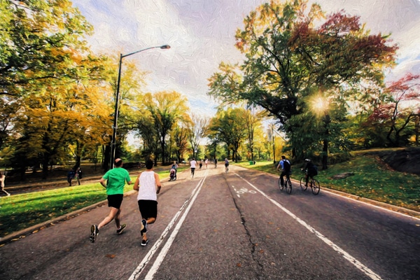 Print, Black frame. Vibrant scene of joggers and cyclists in a park. Autumn colors.