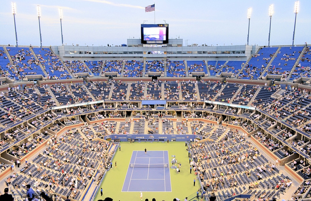 Print, Black frame. Panoramic view of a tennis stadium with cheering crowds and bright lights.
