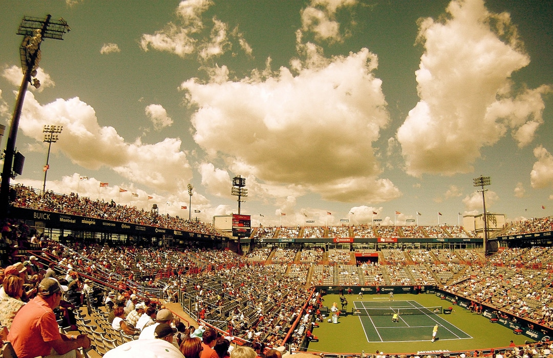 Print, Black frame. Sepia-toned photograph of a crowded tennis match with dramatic clouds.