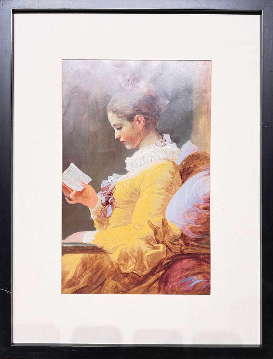 A print of Jen-Honore's 18th century painting of an unknown girl seated in profile with a white ruff collar and cuffs in a yellow dress.