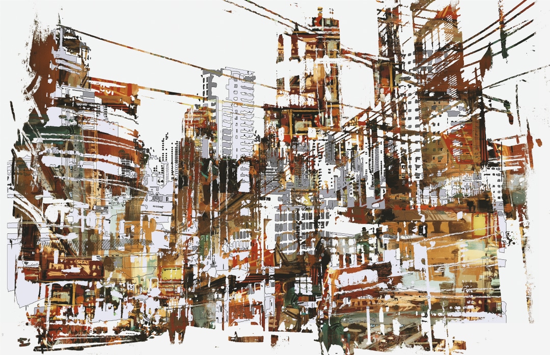 Print, silver frame. Dynamic abstract print of a city skyline in earthy tones using digital techniques.
