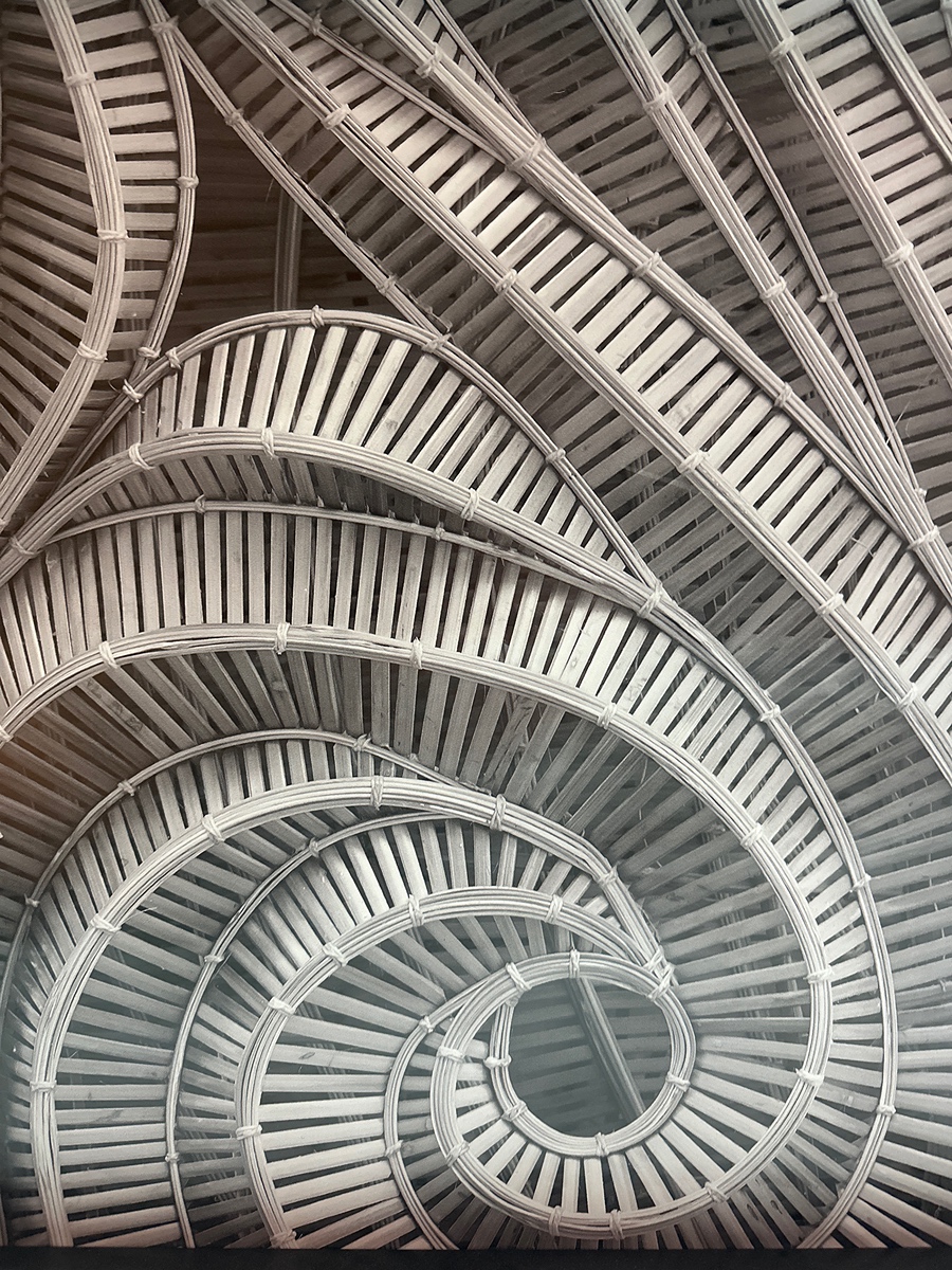 Print, black frame. Black and white abstract print of woven wicker in a spiral pattern. Looks like an endless staircase!