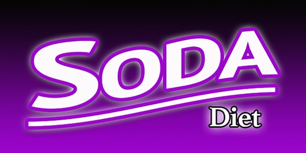 Bold, purple and black sign featuring text 'Soda Diet'. Dramatic gradient background.